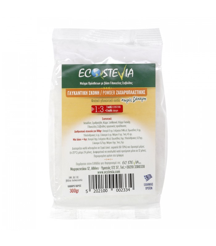 Συστατικά: Ερυθριτόλη, Μαλτοδεξτρίνη, Ινουλίνη, Κόμμι Ξανθανική, Κόμμι Γκουάρ, Γλυκοζίτες Στεβιόλης οργανικής προέλευσης.